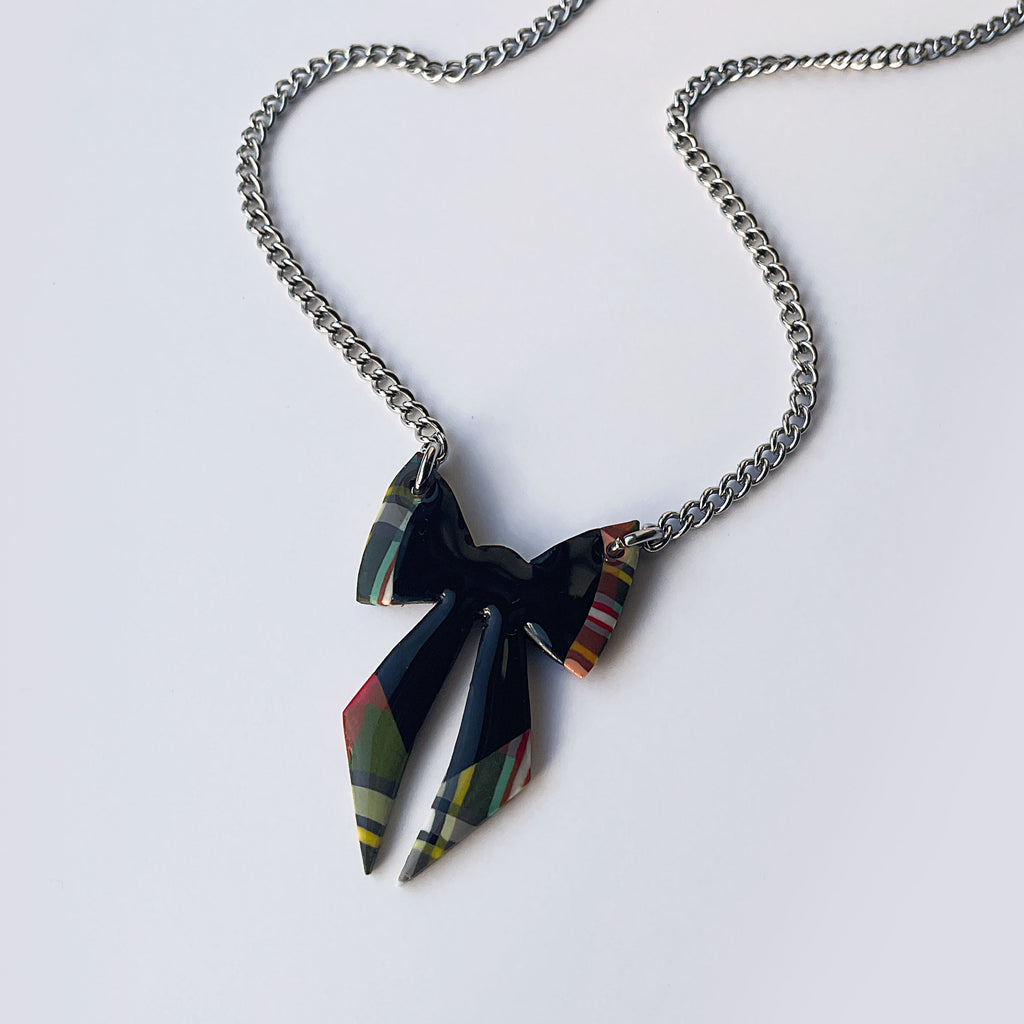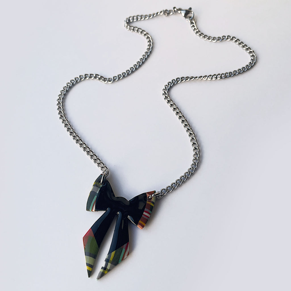 This bow necklace has been handcrafted out of polymer clay and later coated with resin for a glossy finish.